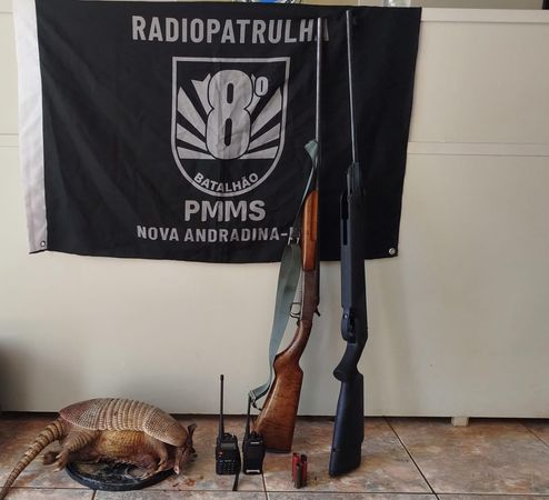 Espingardas, cartuchos, rádios comunicadores e tatu abatido caracterizando crime ambiental foram apreendidos